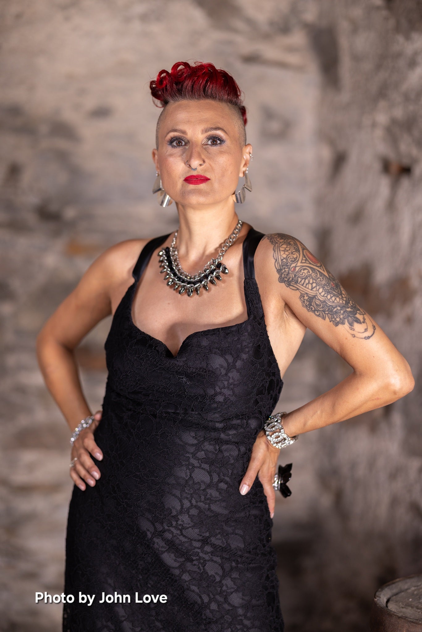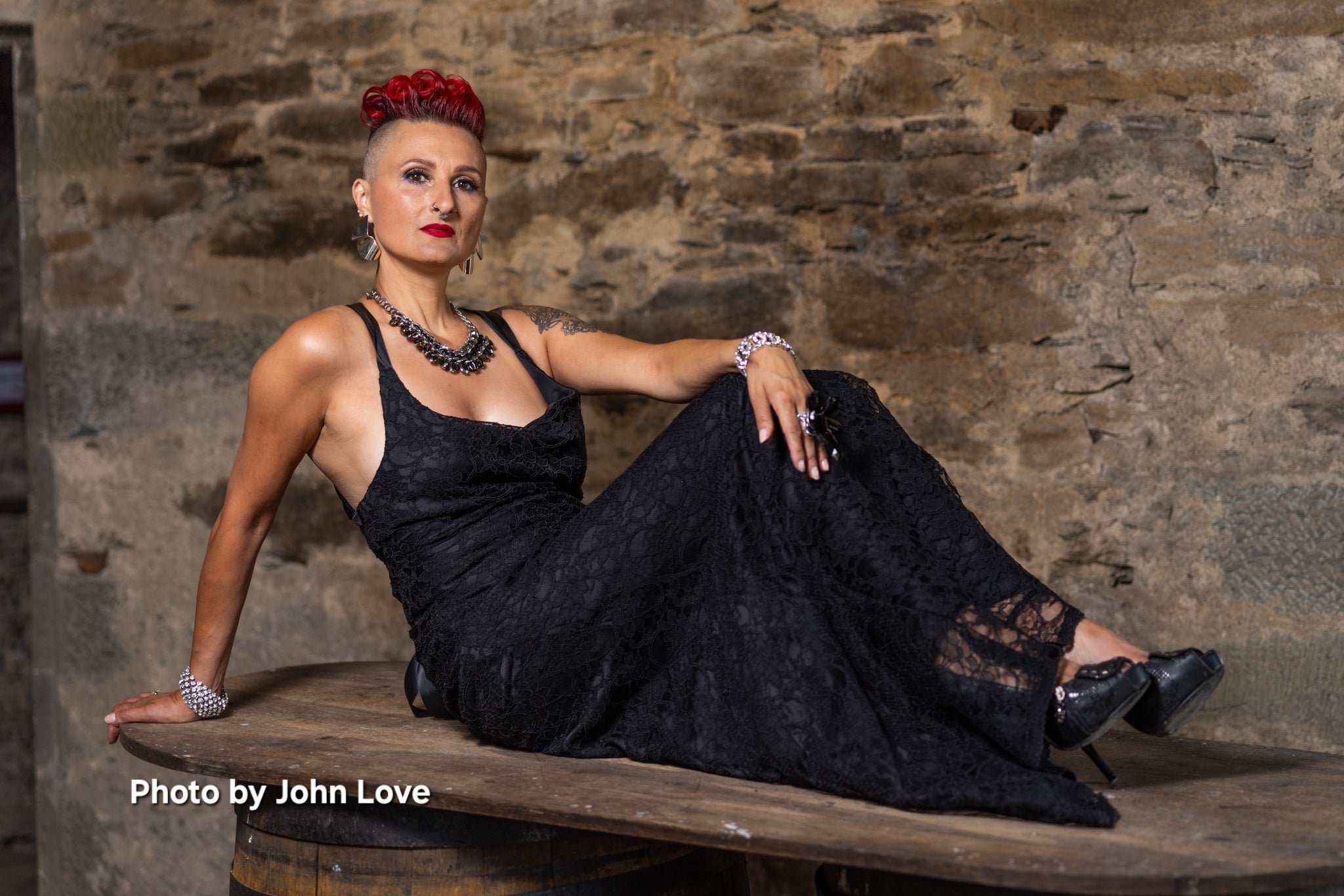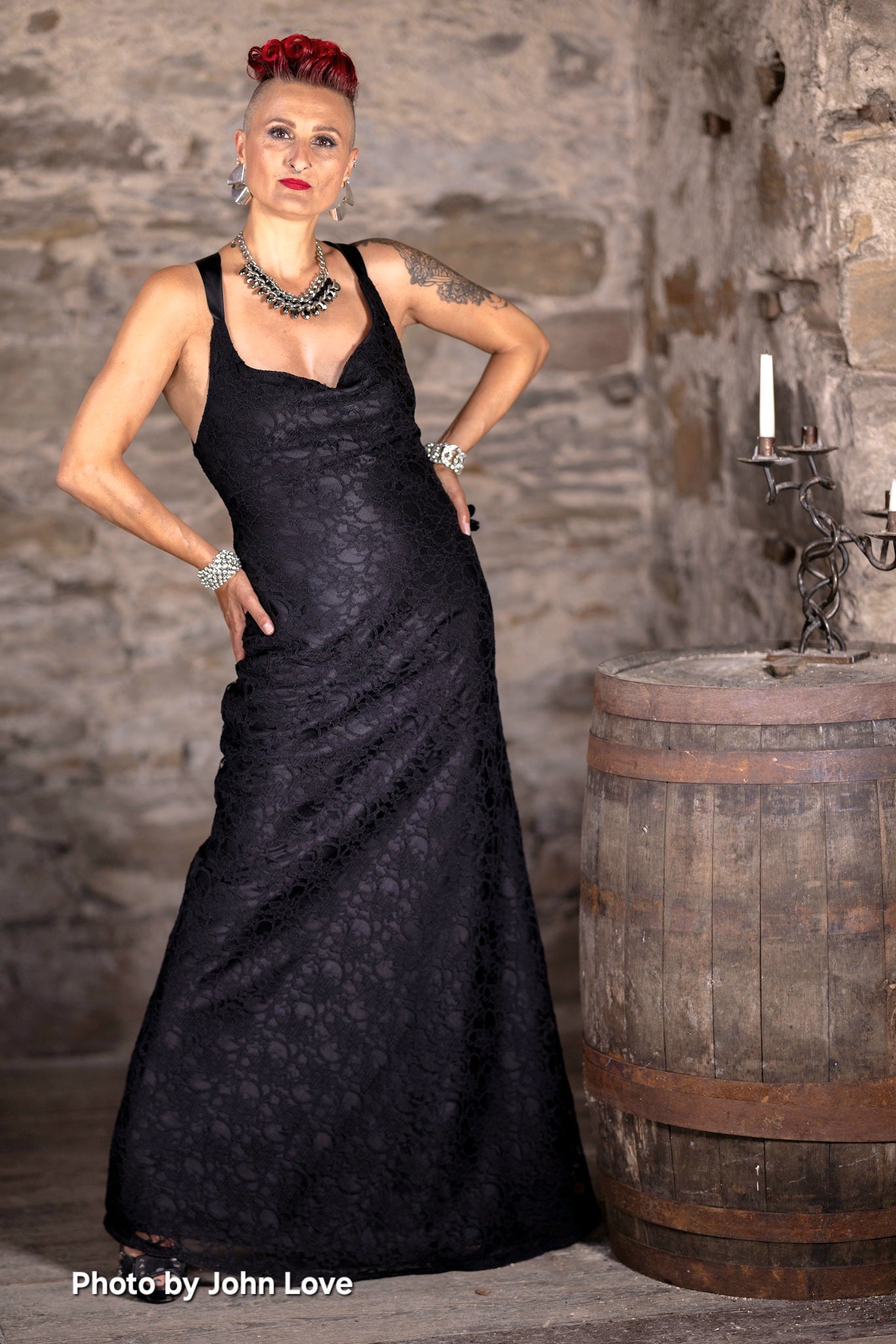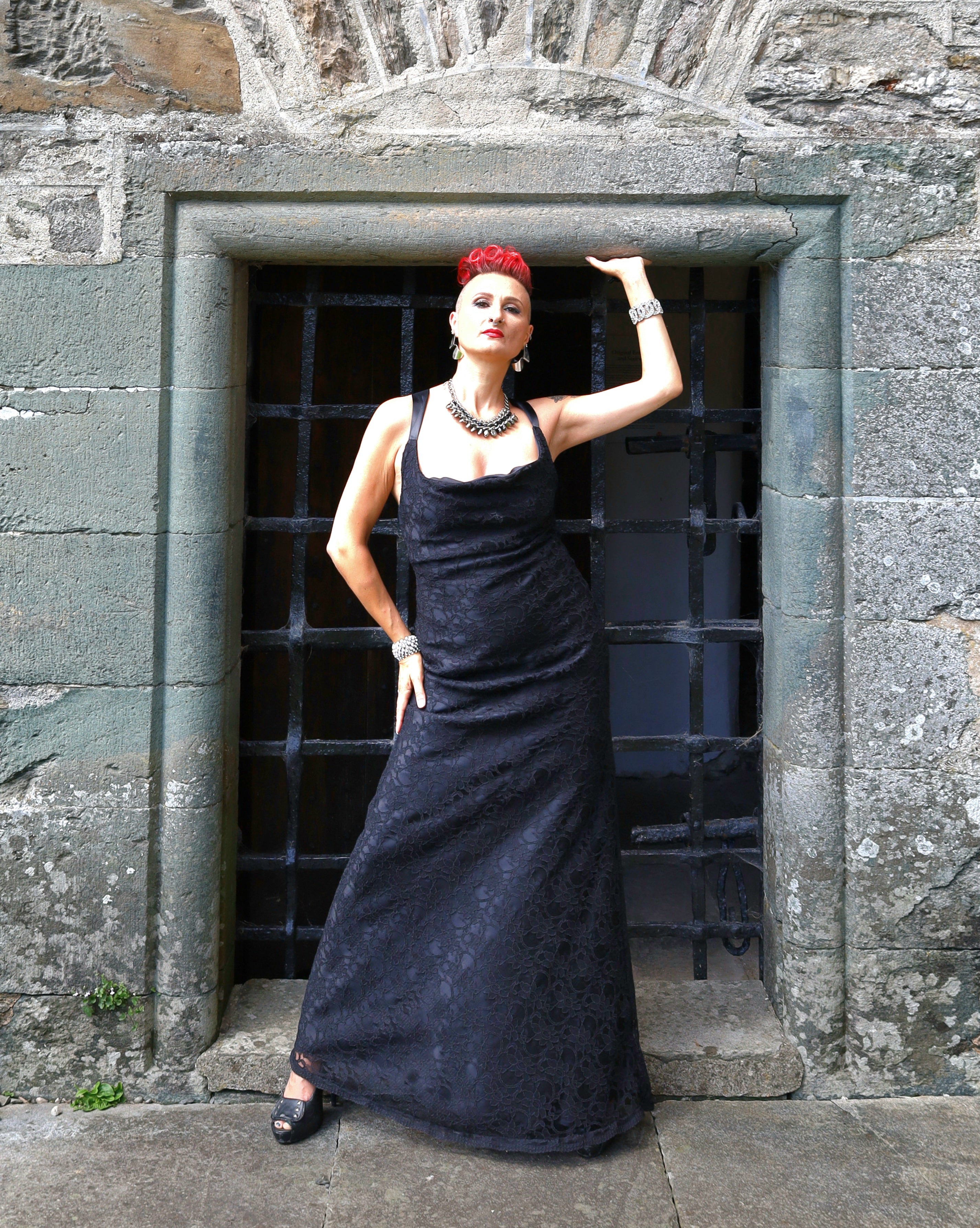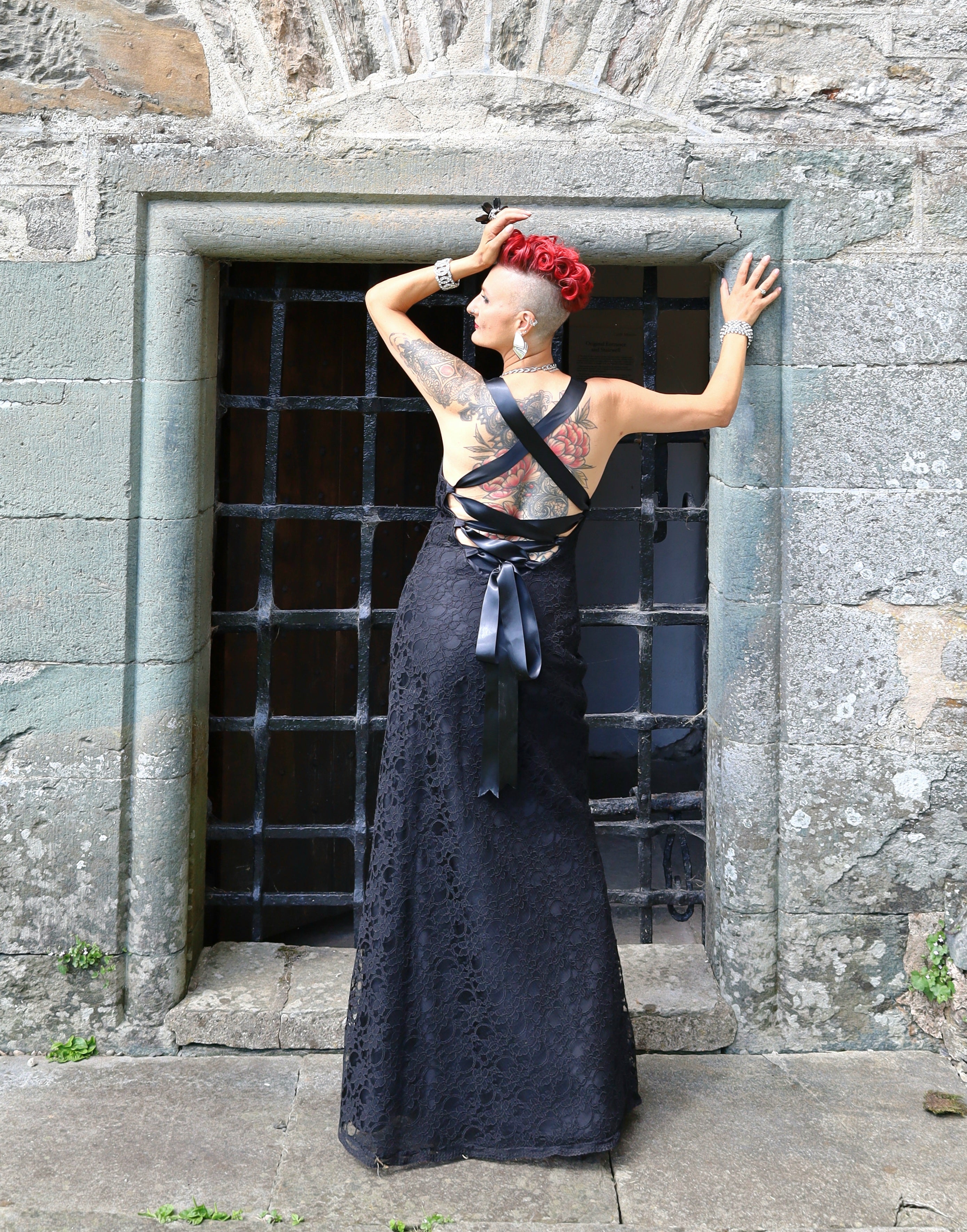 This is a bias cut dress made from exquisite heavy corded lace, layered over gloss satin and fully lined. The neckline drapes beautifully at the front and the dress is backless, held in place securely by ribbon ties down the back. It is  body skimming and slightly flared.